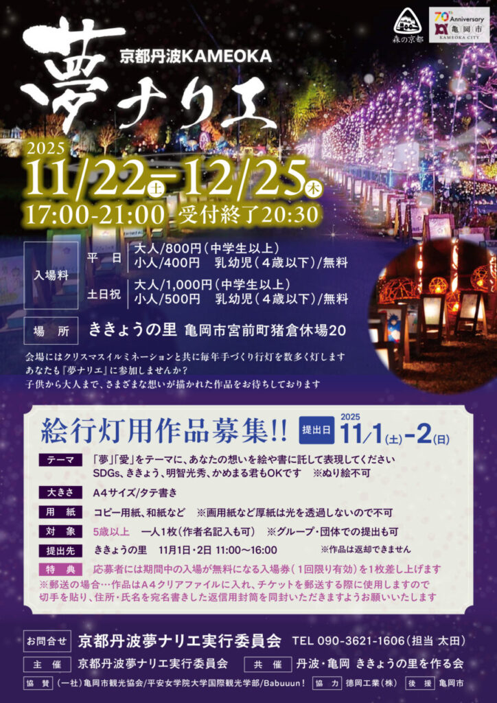 今年も開催の『京都丹波KAMEOKA 夢ナリエ2025』の会場に飾る、絵行灯作品を募集いたします。