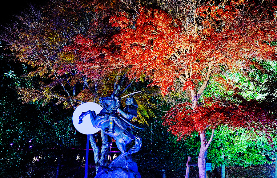 この時期、イルミネーションに照らされ、紅葉と一緒に映る光秀像は、とても綺麗です。