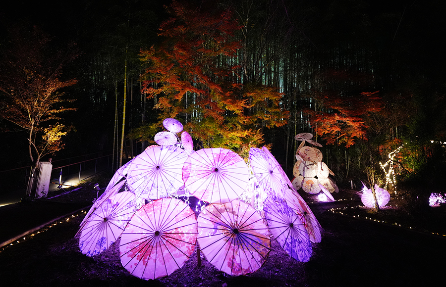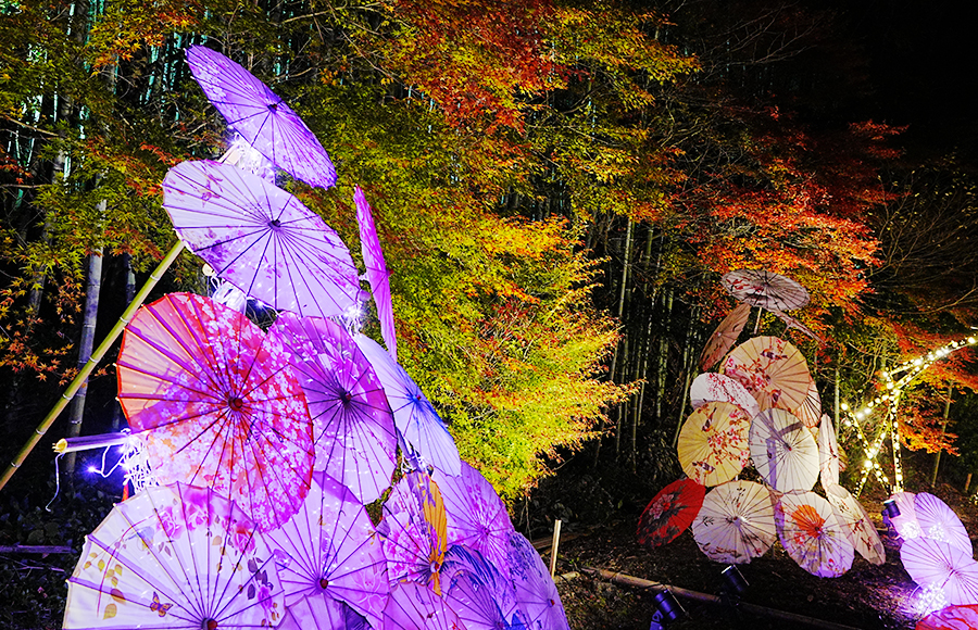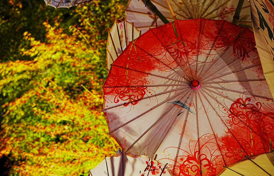 紅葉を背景にライトに照らされた番傘はとても幻想的です。